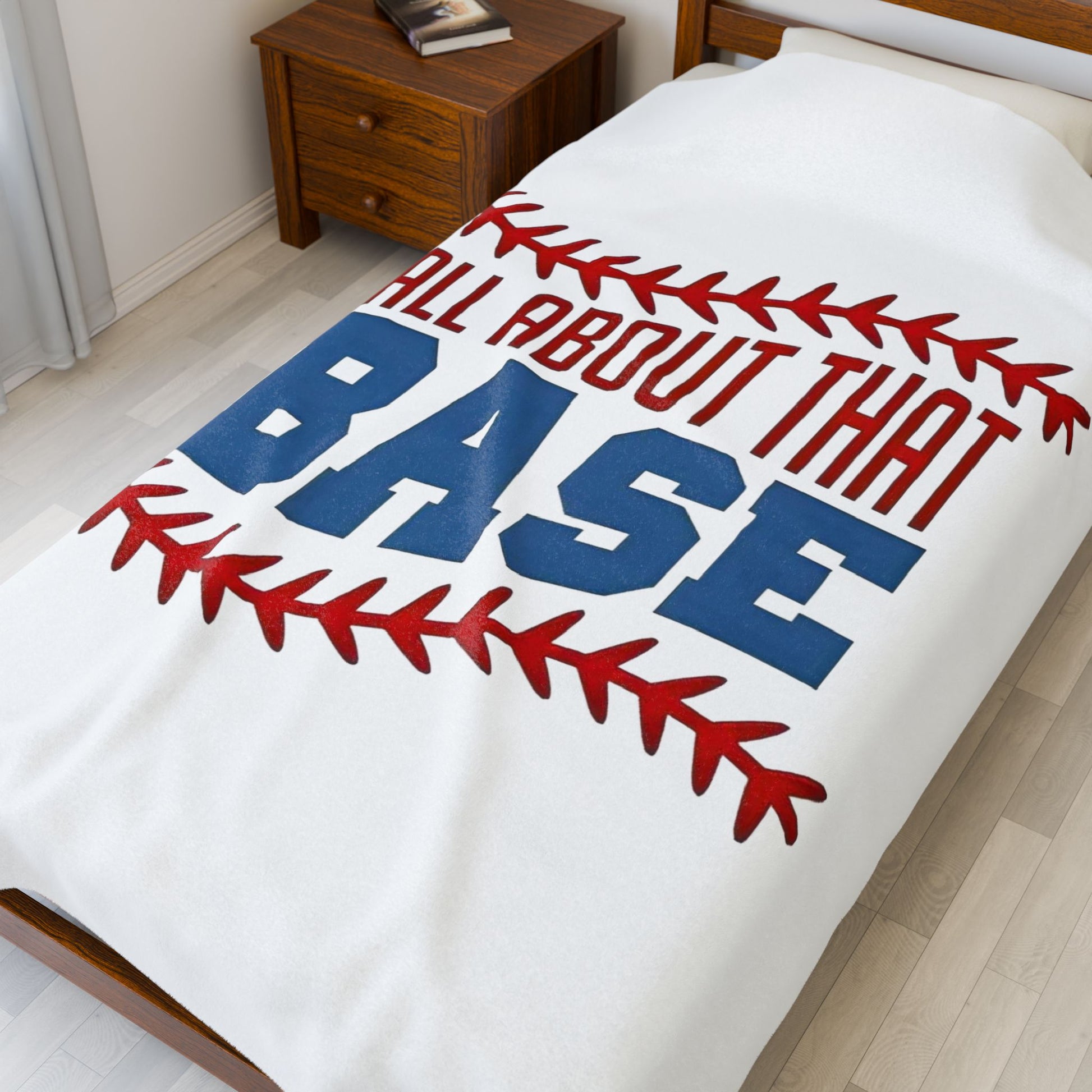 Wrap up in the cozy buzz of game night with this plush velveteen blanket. Soft, medium-weight fabric and vivid one-side printing carry the playful “All About That Base” baseball graphic with bright red stitches and bold team-blue lettering. It settles easily over laps during evening practices, tucks into dugout benches between innings, and becomes the go-to layer for backyard catch or post-game chats. Lightweight enough to carry to the field, yet substantial enough to warm up on cool bleacher seats, it feels lived-in from the first use — the kind of blanket a baseball fan reaches for whenever they want to relive the crack of the bat and the hush of the seventh inning.