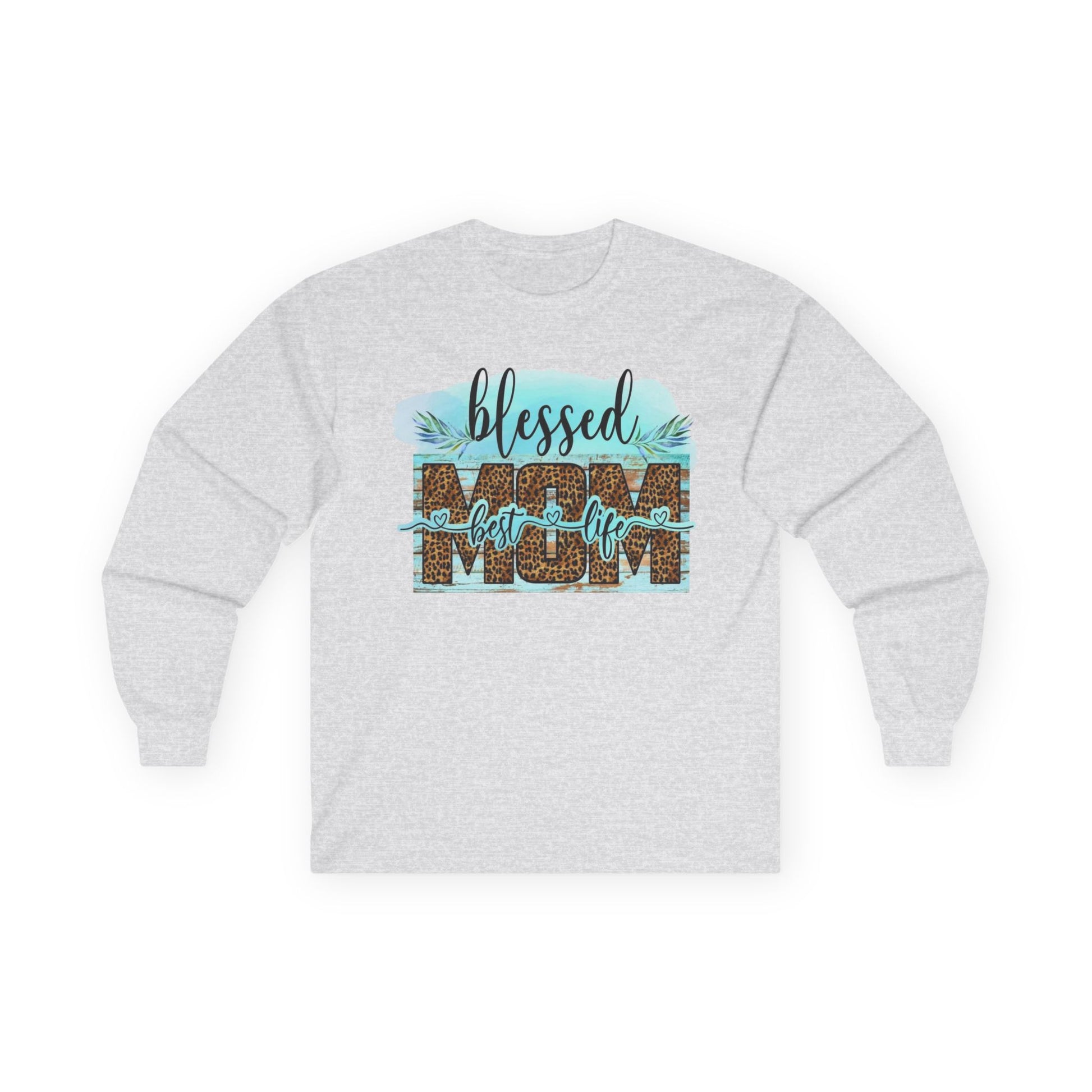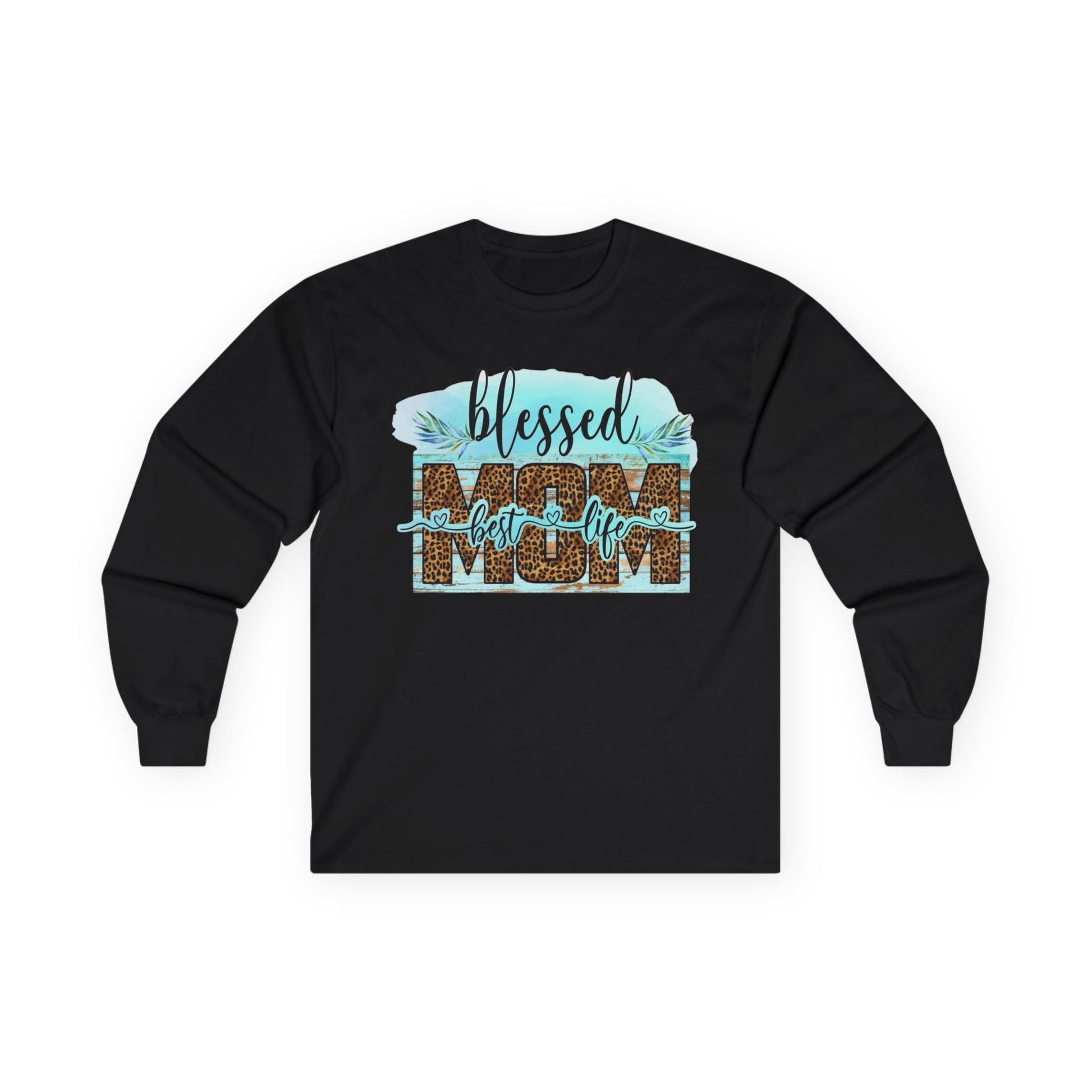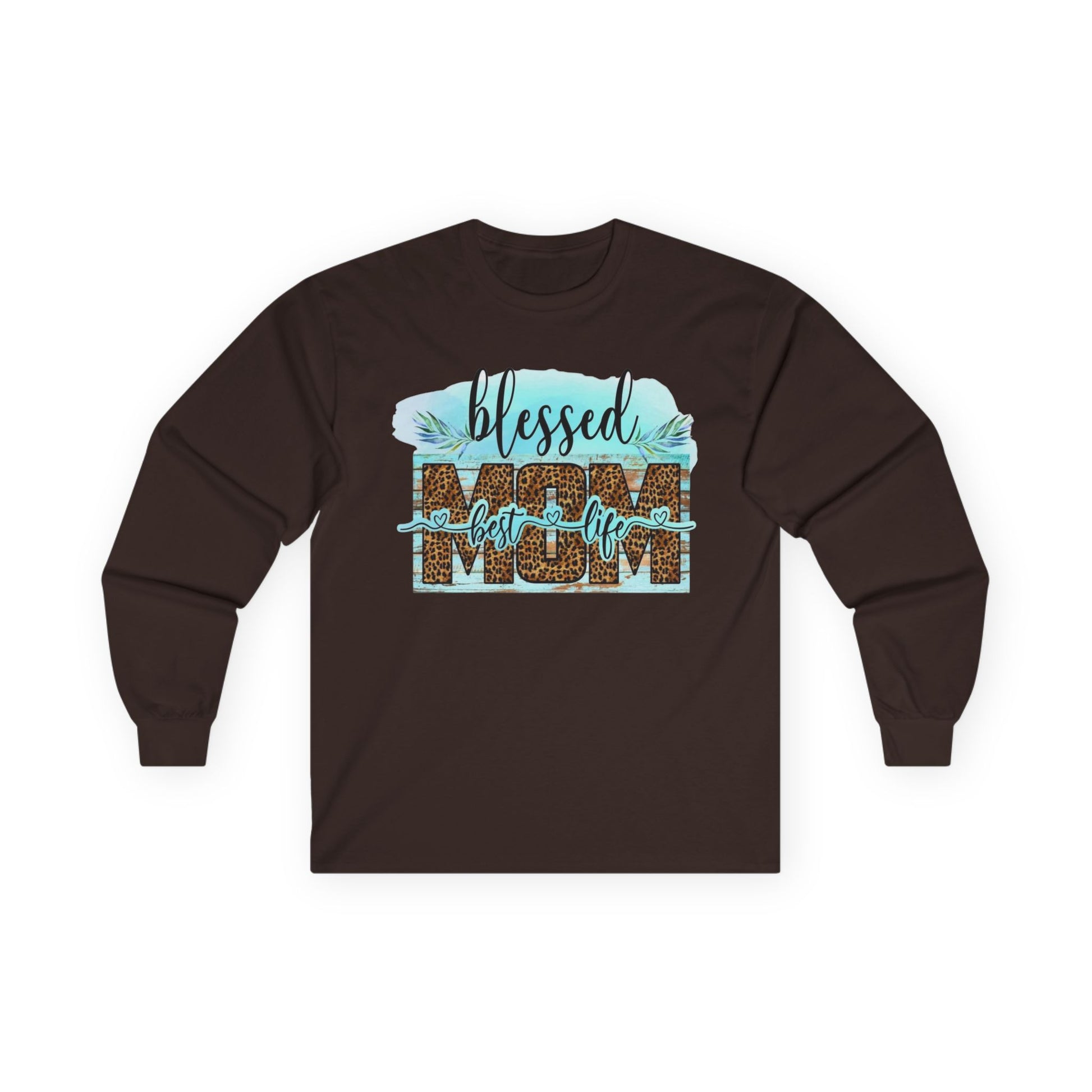This long sleeve tee reads like a quiet, sunny morning at home — warm, grounded, and a little playful. The front art layers weathered leopard block letters with soft turquoise accents and hand-lettered script that says "blessed mama". It sits comfortably on the body with a classic fit and slightly vintage weight, so it feels like a worn-in favorite from the first wear. Wear it over leggings for a slow weekend with coffee, slip it on for school runs, or layer under a denim jacket when you want a little extra warmth and personality. The ribbed collar and taped shoulders keep the shape through many washes, while the thicker, eco-friendly cotton gives it a cozy, substantial hand that complements the rustic-chic design.