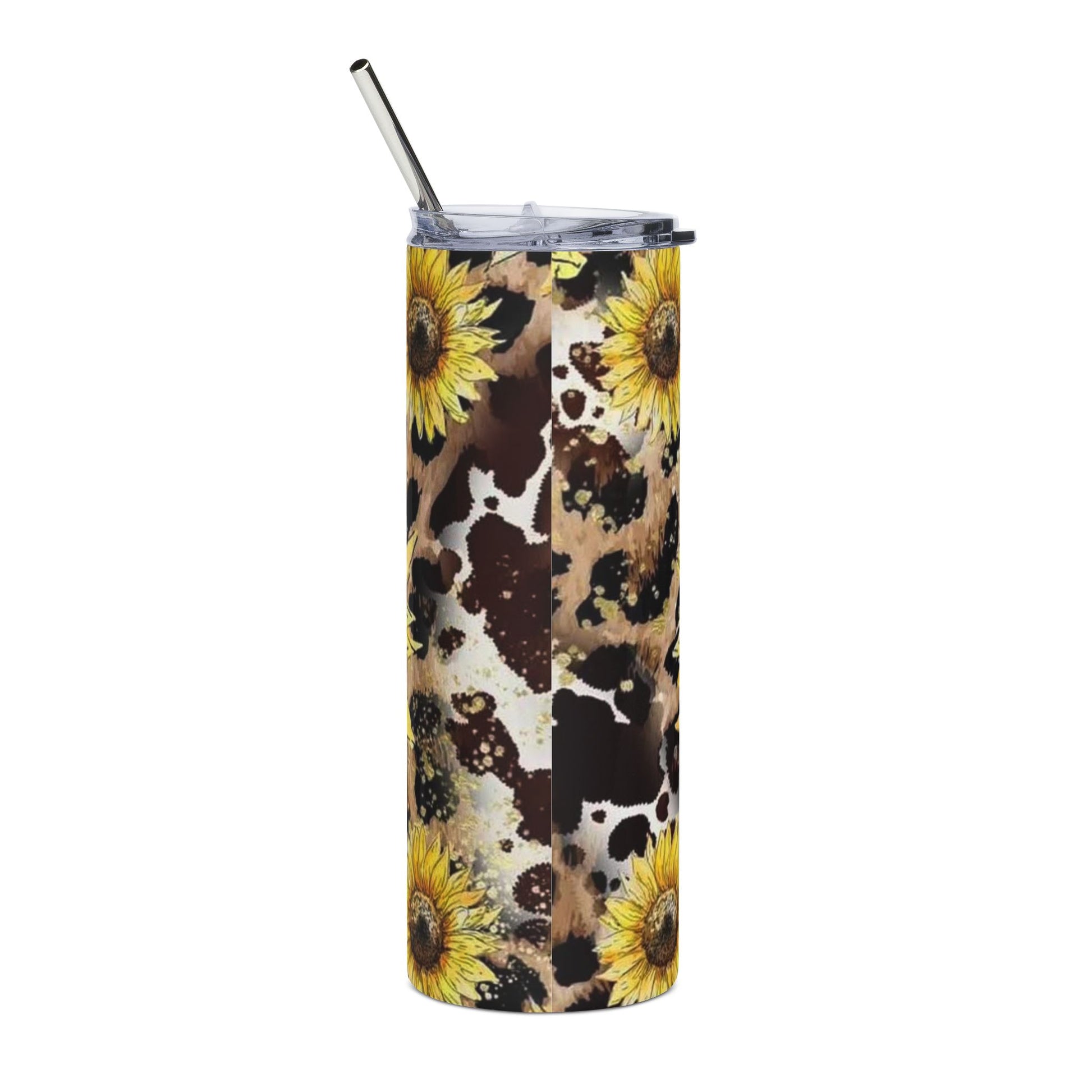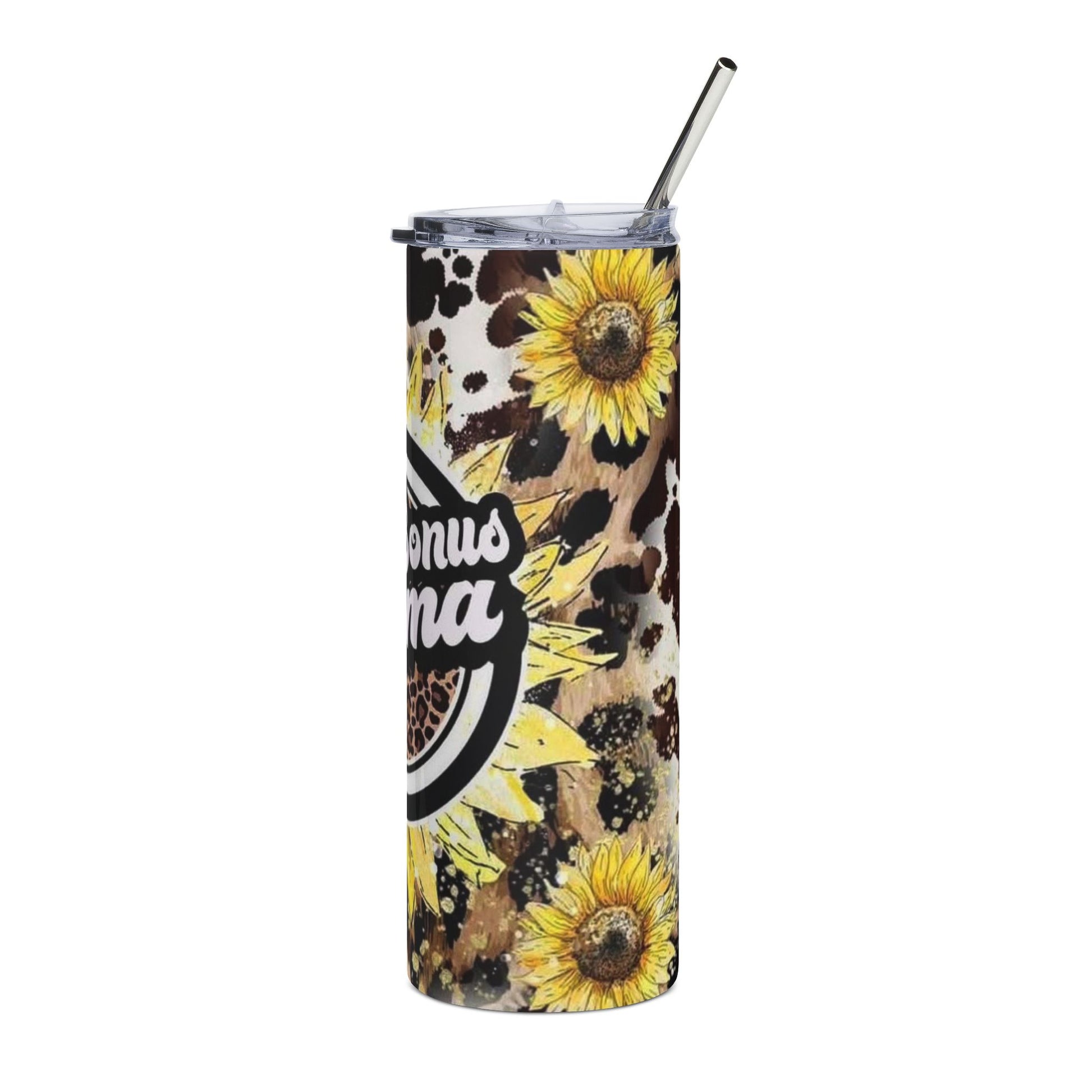 This 20 oz stainless steel tumbler brings warm, sunlit energy to every sip. Wrapped in a lively sunflower and leopard-print collage, it balances bold pattern with a cheerful bonus mama badge. The slim, cylindrical shape slips easily into cup holders and hands, while the glossy protective finish keeps the vibrant design sharp over time. Use it for iced coffee on the porch, chilled teas during long drives, or warm moments when you want a little brightness with your drink. Thoughtful details — a secure lid and reusable straw — make it a practical companion for days spent running errands, chasing kids, or soaking up a weekend garden afternoon.