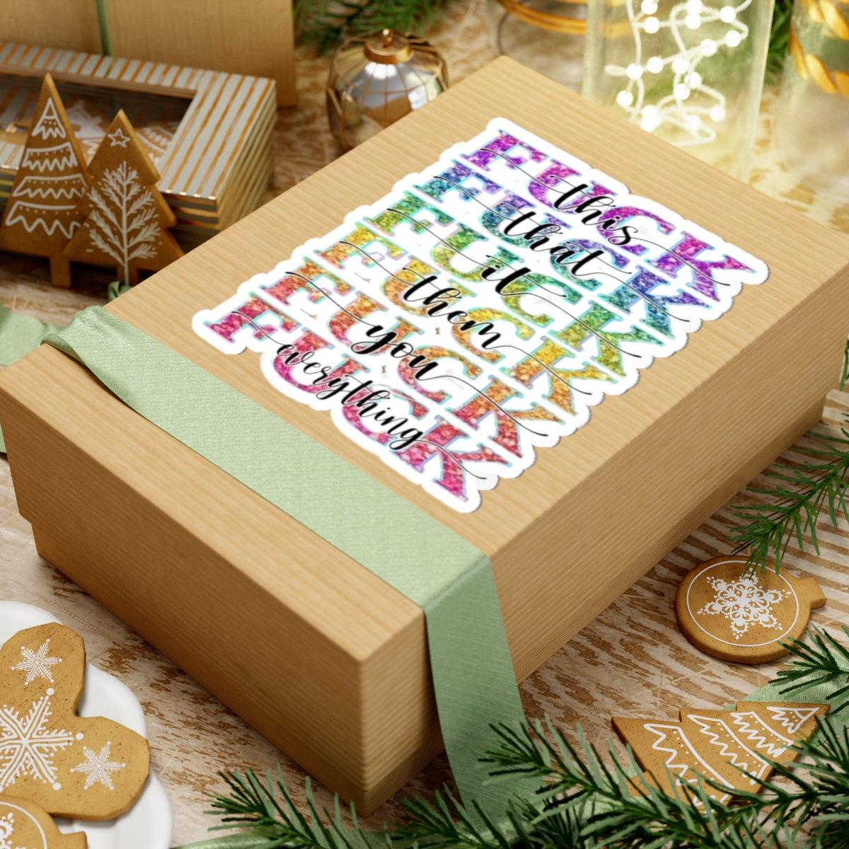 Bright, glossy kiss-cut stickers that turn blunt humor into colorful self-expression. Each sticker features layered, glittery rainbow lettering with a sassy scripted overlay—bold language softened by playful color and shine. The vinyl has a smooth, scratch-resistant surface and a strong permanent adhesive that clings cleanly to laptops, journals, water-resistant tumblers (indoor use recommended), and other flat surfaces. Lightweight and thin, they apply bubble-free and come in four sizes plus white or transparent backing options so you can choose how the colors sit against your surface. Printed with eco-solvent inks on durable vinyl from Japan, these stickers add a loud, joyful accent to everyday items and declare a cheeky, no-nonsense mood wherever they go.