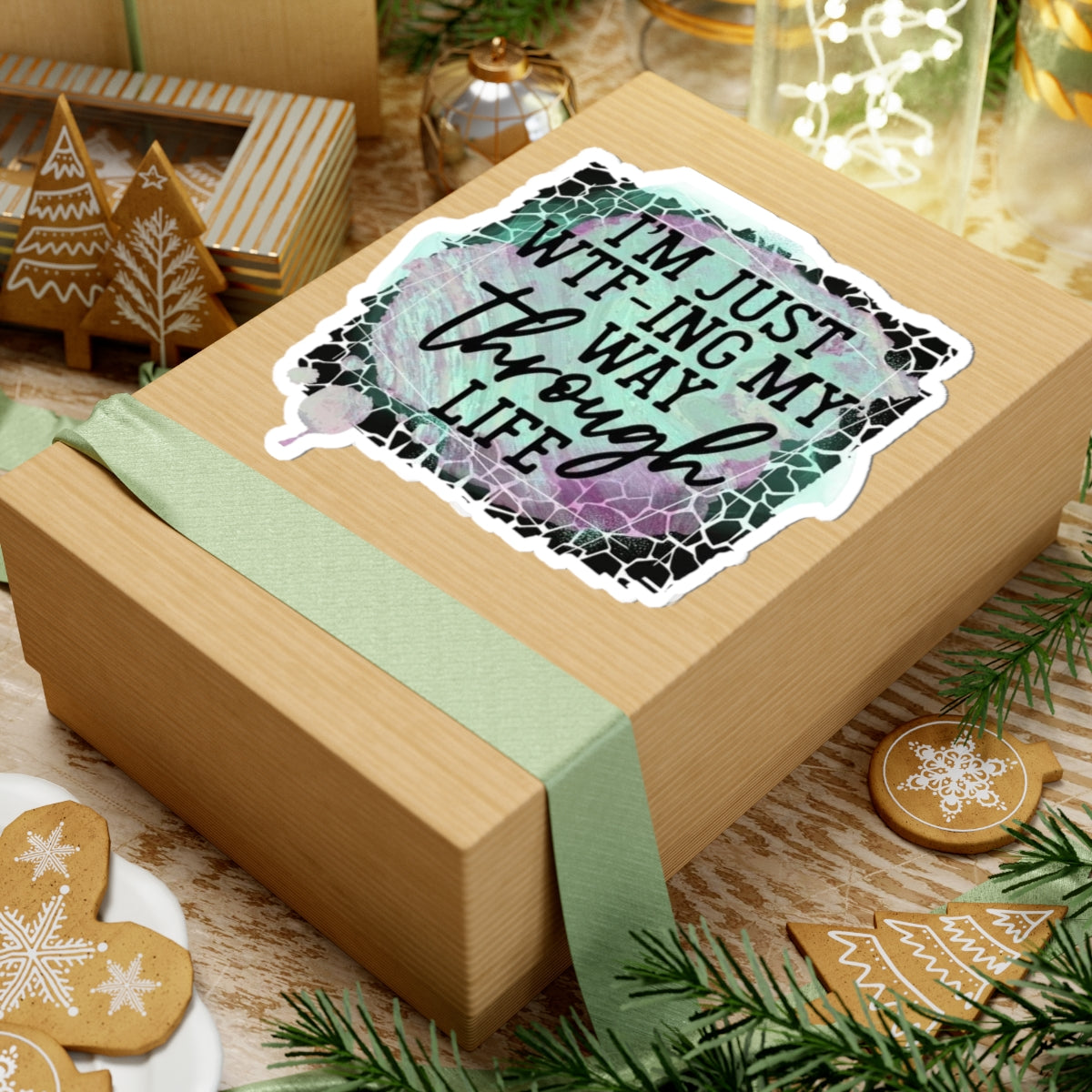 A cheeky, expressive sticker that speaks for those days when nothing makes sense. This glossy kiss-cut vinyl decal features hand-lettered typography layered over a pastel watercolor orb and cracked mosaic frame—bold black script pops against mint and lavender washes. Designed for smooth surfaces like laptops, journals, and planners, it applies cleanly with bubble-free adhesion and holds up to daily handling indoors. Choose white or transparent backing and four sizes to suit your space. It’s for adults who embrace honest humor and want a small, durable piece of personality in their everyday gear.